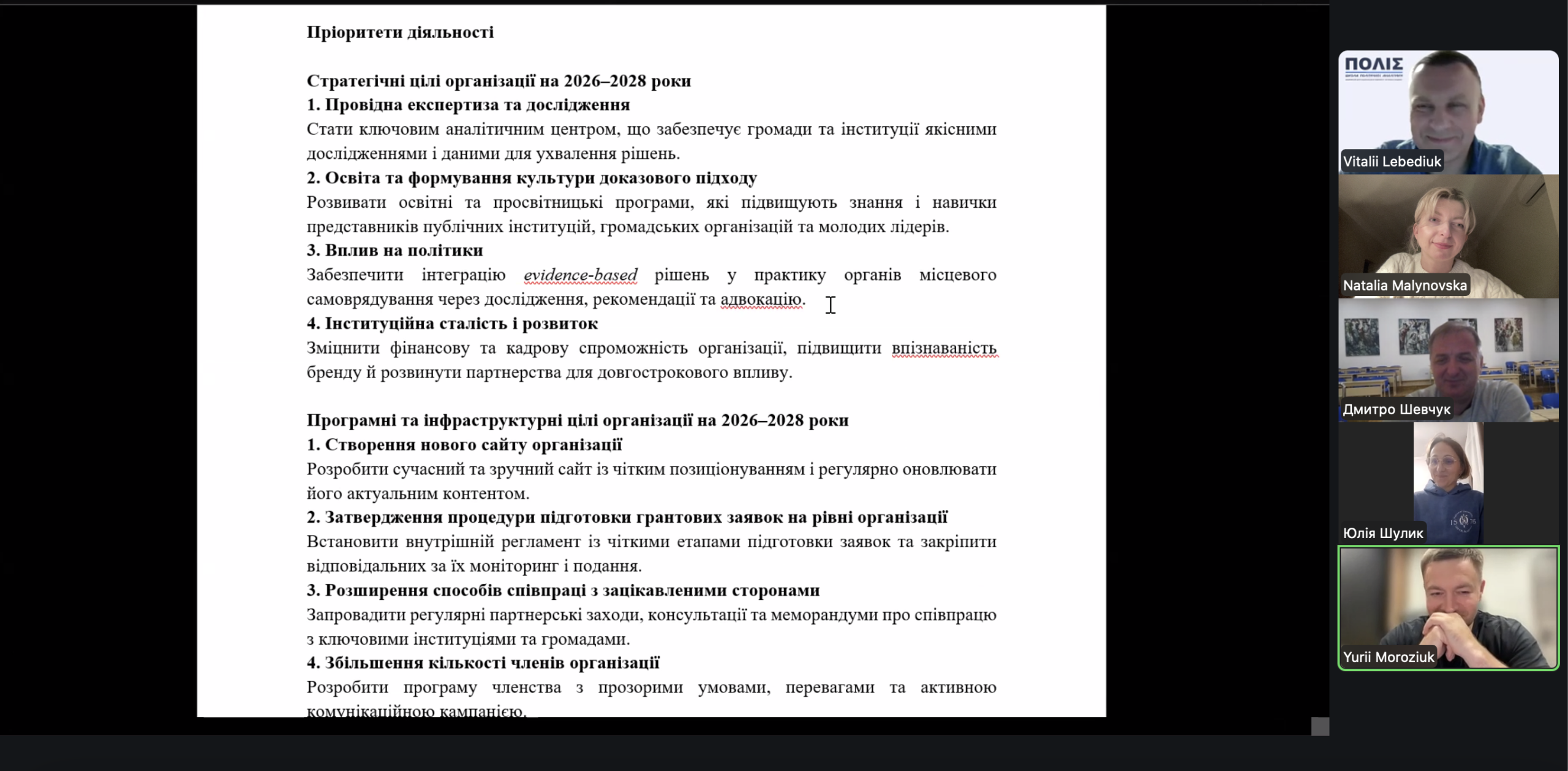 Новий стратегічний документ визначає місію, бачення, цінності та пріоритети роботи ШПА ПОЛІС, а також окреслює програмні та інституційні цілі, спрямовані на посилення аналітичної, дослідницької та просвітницької діяльності організації. Важливим етапом стало формування операційного плану на 2026 рік, що дає чітке бачення реалізації цілей у найближчій перспективі.